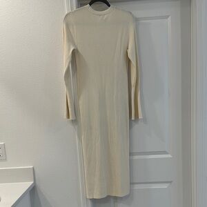 Chic and versatile ribbed knit sweater dress in a soft cream shade. Features long sleeves, a flattering v-neckline, and a full button-front closure with neutral buttons. Midi length makes it perfect for layering or wearing on its own. Effortless style that can be dressed up with heels or kept casual with sneakers or boots. Great for layering with jackets and cardigans. Condition: Brand New With Tags some small call outs. Appears to be a snag on the back of the neck and some pallet dust that I believe will come out in the wash. See pictures. Style Tags: #Minimalist #ChicStyle #SweaterDress #NeutralTones #FallStyle