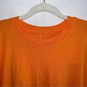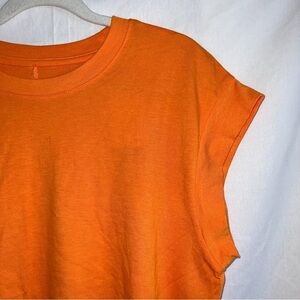 Brighten your wardrobe with this vibrant orange top featuring an extended shoulder sleeve and side slit at the hem.
