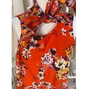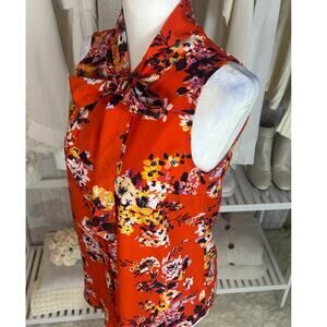 A New Day Women's Size S Orange Floral Tie Neck Sleeveless Blouse #0506