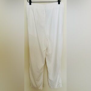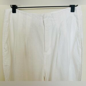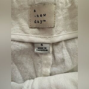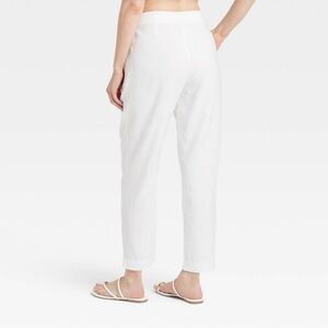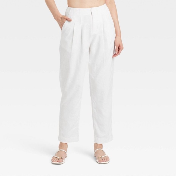 The A New Day Women's Tapered Leg Tailored High Rise Ankle Length Pants in size 6 are versatile and stylish pants suitable for various occasions such as travel, casual outings, parties, or business meetings. Made from a comfortable and breathable fabric blend of 55% linen and 45% rayon, these pants feature a flattering slimming fit with a high rise waist and tapered leg style. The white color and solid pattern offer a classic and timeless look, while the pleated accents add a touch of sophistication. With a machine washable garment care and convenient pockets, these pants are a practical and fashionable choice for the modern woman.