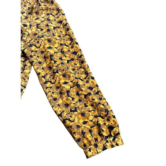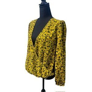 This yellow floral long sleeve blouse offers a sophisticated wrap design with a deep V-neckline. Its elegant floral pattern and vibrant color palette make it a versatile piece, suitable for both work and casual settings. The lightweight material ensures comfort and easy movement.