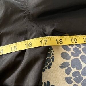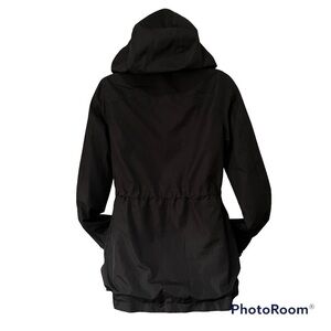A New Day black mid length hoodie windbreaker XS, zipper and snap front closure, 4 front pockets, cinch waist cinch drawstring hoodie, cotton lined, adjustable snaps on cuffs, non detachable hood, water resistant, measurements shown, lightweight, recycled polyester, rain snow cold wind winter, great condition.