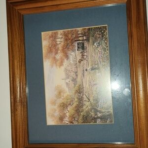 This is a framed art print titled "A New Day" by American artist Carl Valente, depicting an Amish scene. Beautiful blue mat in a wooden frame.
