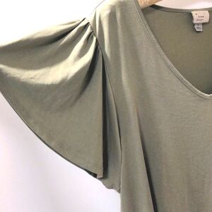 Super flattering flutter sleeve V neck tee blouse with a slight gathered puff sleeve. Nice drapey fabric. Color is between sage green and olive.