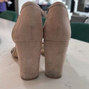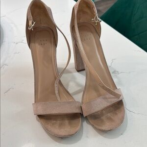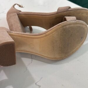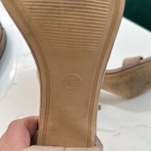 A. New. Day heels. Women’s size 10. Tan in color. Heel measures 3.5”.