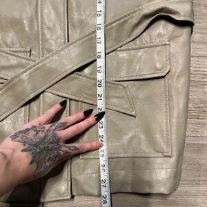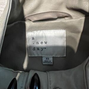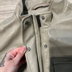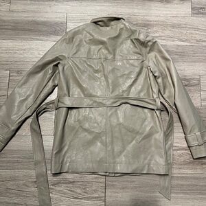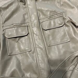 If you want a coat perfect for fall this is it. Beautiful tan faux leather jacket that is perfect for those chilly autumn days walking through the piles of leaves. Jacket is lightweight enough that it would be perfect to pair with a sweater.