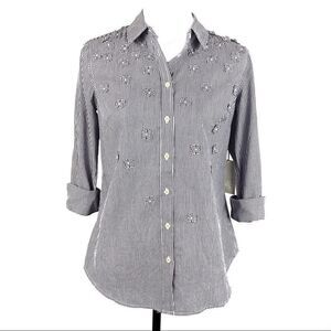 Blue and White Stripe top with flower appliqués by A New Day. Size Small women’s. Collared, button down shirt with cuffed sleeves. Wear alone or add a white or blue tank top for a casual spring or summer look.