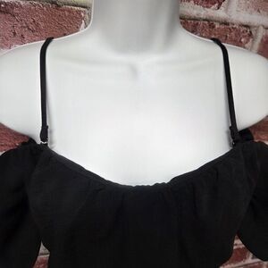 off shoulder black top, slim fit side zip blouse, A New Day ruched shirt, recycled polyester crop top, XS black fashion tee, edgy feminine top, casual going out top, short sleeve off shoulder shirt, women’s trendy tops, eco-friendly black blouse