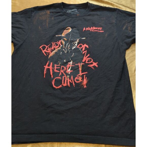 Ready or not… this tee is awesome. Classic Freddy Krueger graphic with “Ready or Not, Here I Come!” text on a black shirt. Tagged Men’s Large. Measurements: pit-to-pit 20.5", length 27.5". The shirt has a bleach-speckled/distressed look across the shoulders—unsure if factory distressing or added later, but it fits the horror aesthetic (see photos). Soft, broken-in cotton; print still pops. Great for fans, collectors, or Halloween fits. Ships fast and folded with care.