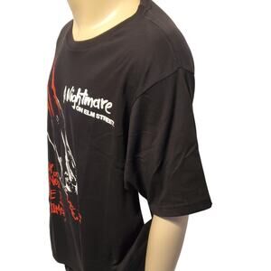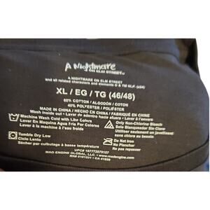This A Nightmare on Elm Street Graphic T-Shirt in size XL features a classic black color with a graphic print of the iconic character Michael Myers. Made from cotton material, this short sleeve shirt is machine washable for easy care. Perfect for fans of the horror movie genre, this unisex t-shirt is comfortable to wear in any season with its tagless design and regular fit. Whether it's winter, summer, fall, or spring, this t-shirt is a stylish choice for anyone looking to add a touch of movie nostalgia to their wardrobe.