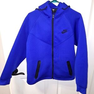 This is a blue Nike hooded full zip neoprene jacket. It's in excellent condition. Honeycomb pattern. The material has a neoprene feel. Active , athletic, athleisure, fall, winter, warm, comfy, and stylish. 22" PTP, 26" length