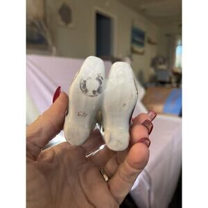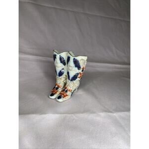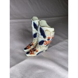 The product is a pair of Imari pattern boots made of porcelain/china in blue, white, and red colors. They are collector plates and come unboxed. The boots are marked "113" and are likely from Japan.