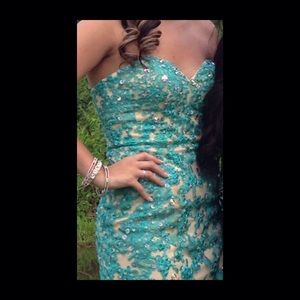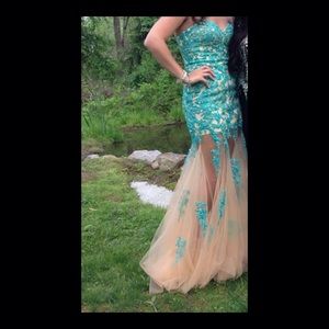 Gorgeous Jade and nude color! (Jade is similar to teal!) Wore to one prom and has been hanging in my closet since! The dress is a size 6 and fits extremely comfortable! I am 5'4", and the dress was long so I did heals on! In the pictures I'm in heals that make me 5'8" if that gives you an idea of how long the dress is! I personally did not take a picture from behind on prom so I included one from a website!