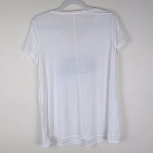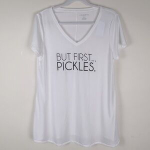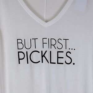 Comfy, stretchy, lightweight V neck tee shirt. But First Pickles graphic. Center seam in back. Short sleeves.