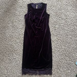 Beautiful maternity dress by A Pea in the Pod. Plum color with a red hint, soft velvet fabric, knee length, decorative lace hem, zip up back with button at top.