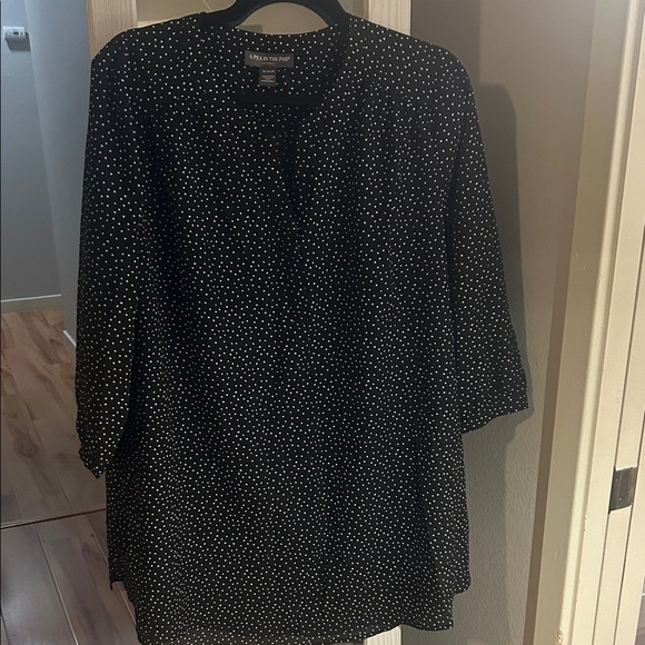 Elegant black blouse with white dot pattern. Features a relaxed fit and three-quarter sleeves. Ideal for any occasion.