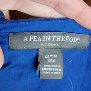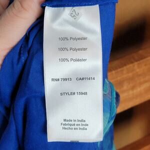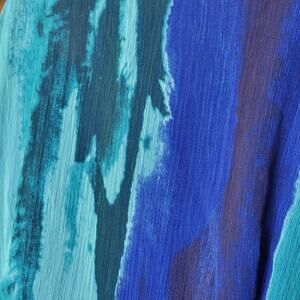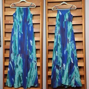 Elegant maxi dress with a flowing silhouette. Features a vibrant blue and green pattern. Perfect for a stylish look. The strap across the back is broken but could be fixed with a simple stitch. Wanted to love this dress but it was too small for me in my third trimester.