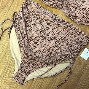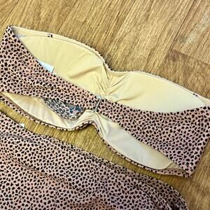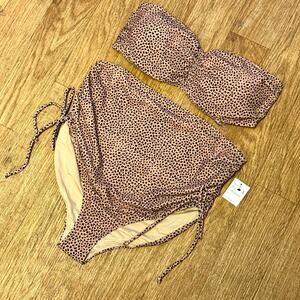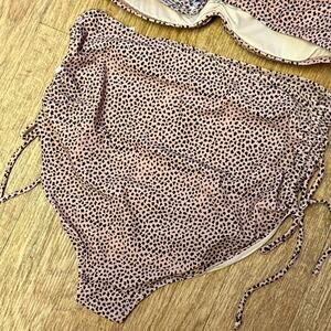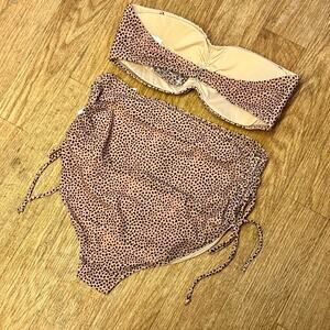 • Other information: This two-piece swimsuit set features a bandeau style bikini top with cinching between the breasts, removable pads, and a hook closure. Straps are included attached to the tags, should someone desire to use them. The swim bottoms are high-waisted with side ruching detail and adjustable side ties.