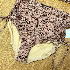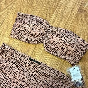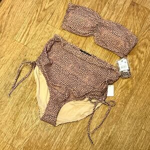 • Other information: This two-piece swimsuit set features a bandeau style bikini top with cinching between the breasts, removable pads, and a hook closure. Straps are included attached to the tags, should someone desire to use them. The swim bottoms are high-waisted with side ruching detail and adjustable side ties.