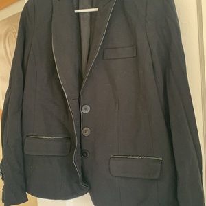 A pea in the pod black maternity blazer, size small. Vegan leather trim, 3 button closure. Slit in back but still sewn together. Buttons on sleeves.