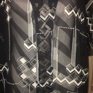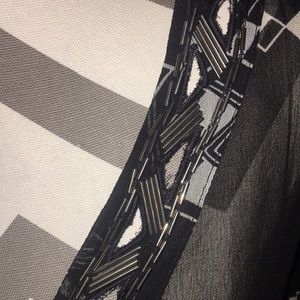This blouse can easily be worn with an undershirt and black leggings! The blouse has a v-neck with beautiful long silver beading around the neck and down the center. The geometric print is very flattering!!