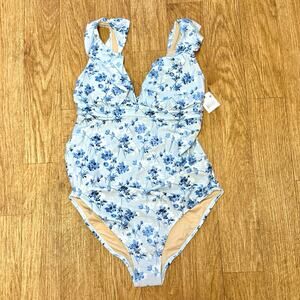 A Pea in the Pod Maternity Blue Floral Ruffle One-Piece Swimsuit Size Medium