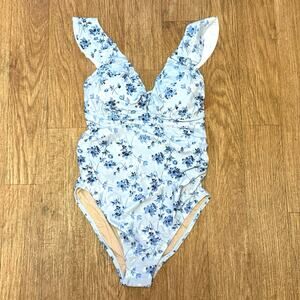 A Pea in the Pod Maternity Blue Floral Ruffle One-Piece Swimsuit Size Small