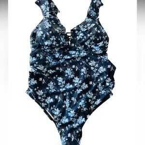 A Pea in the Pod Ruffled Maternity One Piece Floral Swimsuit Medium Blue L NWT