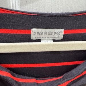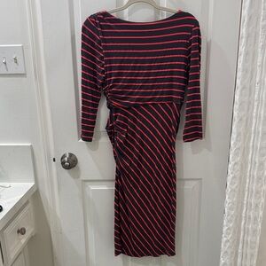 Chic asymmetrical dress with bold stripes. Features a draped neckline and three-quarter sleeves.