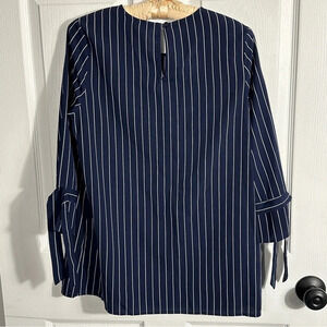 A Pea in the Pod gorgeous navy and white striped maternity shirt, size XS. Button closure at back of neck, tie detail at end of 3/4 length sleeves.
