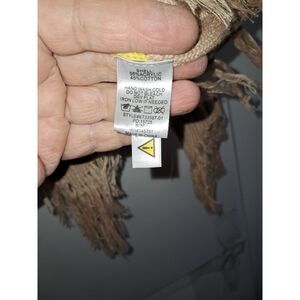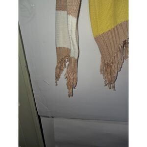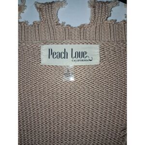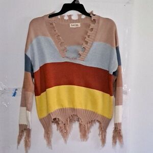 This is a sweater by Peach Love California that is purposely distressed and raggedy looking. This has vertical stripes and I guess you would call that a v-neckline. This is a size L 55% acrylic and 45% cotton. 23" from armpit to armpit and about 24" from shoulder to hem.