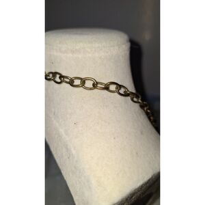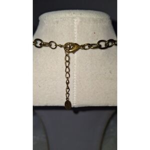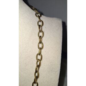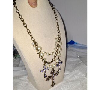 This piece has 3 layers, one of chain and two of faux pearls and the bottom layer has 3 rhinestone crosses hanging from it. This is a statement piece with almost a vampire vibe. It is in nice pre-owned condition, and the first layer is 16" long with a 2" extender. The chain on this piece is a dark bronzy color.
