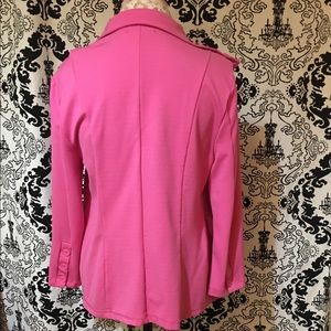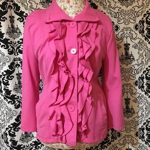 This is a fun pink jacket with 3 sets of ruffles down the front. Nice soft fabric. Great for a nice fall or spring day.