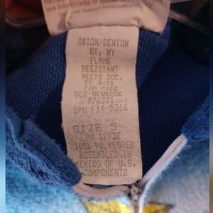This is a one-piece zip-front sleeper made from soft fleece with attached feet and ribbed cuffs for warmth and comfort. Flame-resistant fabric for child safety.