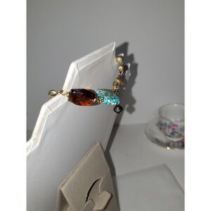 This is a pretty Premiere Designs piece that has a lot to look at. There are some stones that are a faux turquoise and some that look like amber. It also has a few piece that look like dyed shell. Between the pieces is a silver tone chain that has round open links. This is about 20" long and in very nice pre-owned condition.