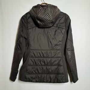 Active, breathable jacket for medium and high level activity. Longer hem, fleece stretch side panels for mobility, cozy stretch thumb holes in sleeves, double front zipper, adjustable hood, vented back shoulder panel, water + abrasion resistant.