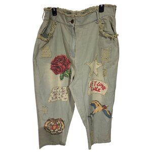 A Rare Bird Handmade Distressed Cotton Patchwork Pants With Unique Embroidered D