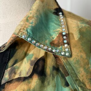 This unique dress features a green camouflage print with embellishments on collar and pocket flaps. Made from high quality materials, this dress is not only stylish but comfortable to wear.