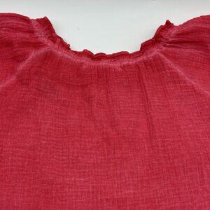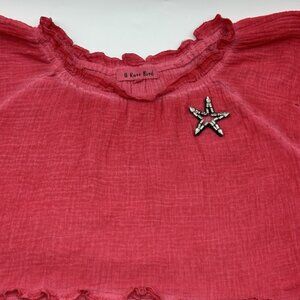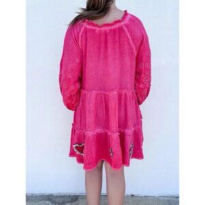 This listing is for a pre-owned women's A Rare Bird 'Shine Bright' pink gauzy knit cutout bling tunic short dress in a one size. This dress is in good used condition with no stains or rips, and features cutout stars and hearts along dress that are blinged out with studs/rhinestones, cutout 3/4 balloon sleeves, and a tiered ruffle skirt. This dress is made out of 100% cotton. Measurements are: front top of collar to bottom vertically is 38“, back top of collar to bottom vertically is 35“, top of collar to end of sleeve is 24“, chest (pit to pit) is 52“, waist is 50”, hips is 78“, and bottom hem of dress is 96“. Please see all listing photos, as this listing is for sale in as/is pre-owned condition.