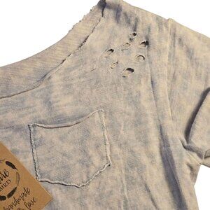 This A Rare Bird top offers a unique blend of style and comfort, featuring a distressed design with eyelet and pocket details. Its soft cotton fabric provides a cozy feel, while the handmade touch adds a distinctive charm. Suitable for casual outings or relaxed gatherings.