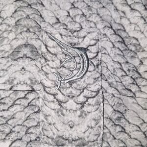This is a Reel Legends men's medium silver fishscale patterned long sleeve button-down shirt. EUC. Vented , sleeve ties, with zippered vertical pockets. Breezy, light, airy, beachy fishing gear.