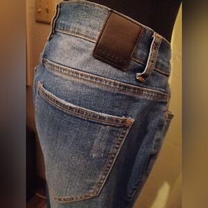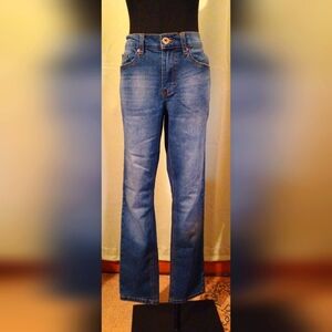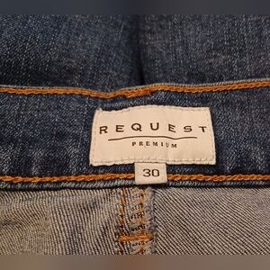 request premium blue denim jeans. pre-owned in excellent condition. see pictures. they are part of the description. men's. no more baggy, saggy jeans. comfortable hips don't lie. slim straight leg.
