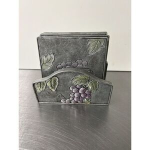A. Richesco Corporation Metal Handpainted Raised Flower Fruit Art  Grapes Coaster Set with a stand. Excellent condition.