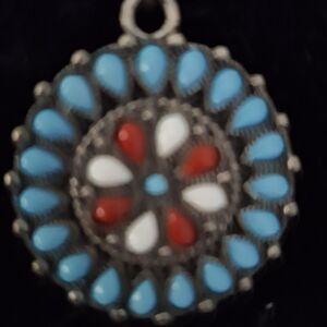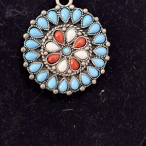 This is a vintage Robert Rose necklace on a suede cord with a faux turquoise and faux coral beaded pendant. This has a Native American vibe with nice coloring. The necklace is about 16" long with a 2.5" extender and the pendant is 1.5" in diameter. It is in very good pre-owned condition with some wear on the back of the pendant.
