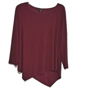 This is a deep red top by Rouge Collection. This is long sleeved with an asymmetrical hemline and rounded neckline. 90% polyester and 10% spandex. It is in very nice pre-owned condition and would be great for the office, or dress it up a little and let it take you to a cocktail party. 26" from armpit to armpit and 34" from shoulder to pointed part of hem.