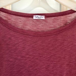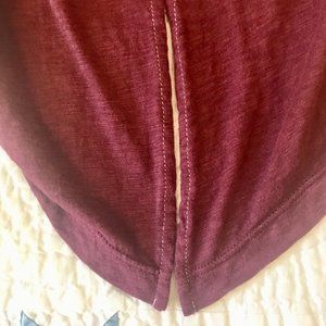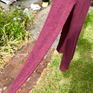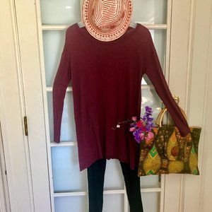 Calling all leggings and slim jeans: I'm your top pick! I'll transition you from summer to fall and garner admiring glances from all. The rich burgundy complements myriad patterns and color-ways. White contrast stitching at 12" slit side-vents. Super soft, fine knit 50% Pima Cotton/50% Modal. 28" from neck to hem. 19.5" between underarm seams across chest. (Note: Vintage barkcloth handbag has sold.)