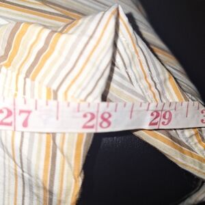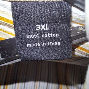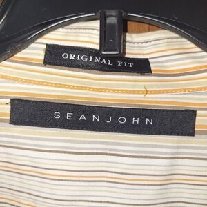 This is a Sean John men's long sleeve button-down shirt in a size 3XL. It's orange, brown, gray vertical stripes. It's pre-loved and in great condition (see pics). Office, business casual, work, preppy, everyday wear.