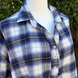 Supremely wearable, relaxed take on a classic plaid. This A Shirt Thing popover top features a soft navy/black/ivory check in premium brushed cotton flannel, relaxed fit, half placket, and button cuffs. Effortless layering piece—wear tucked or loose. In excellent condition.