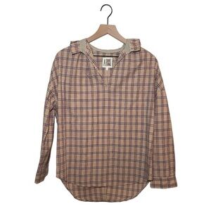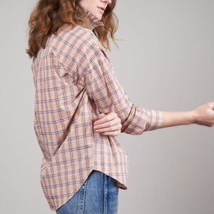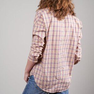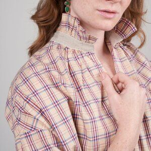 A Shirt Thing Penelope Plaid Ruffle Neck Popover Blouse in Toast/Beige Multi