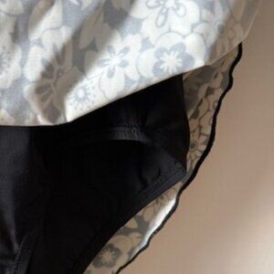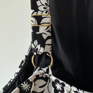 This very cute bathing suit has a black and white shell with a floral design and a solid black suit underneath. This suit has an empire waist and adjustable straps. It measures 31 inches in length from the shoulder to the hem and 19 inches in width from under the arms. This suit is in perfect, like-new condition.